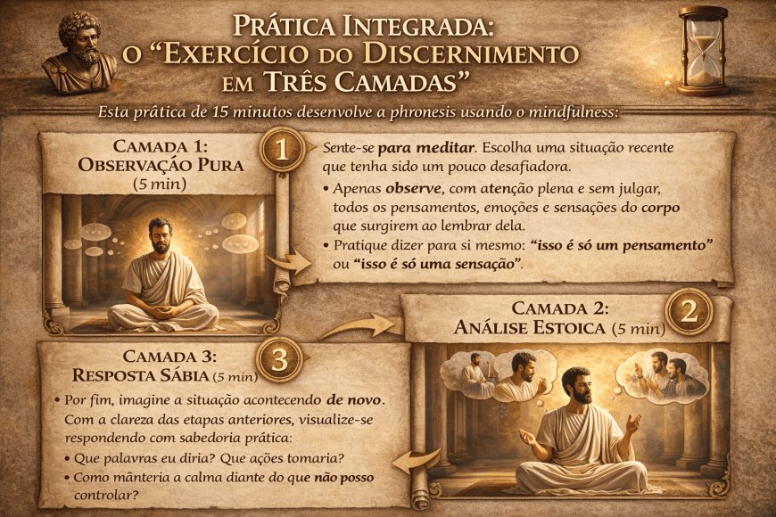 A união do mindfulness com o estoicismo cria uma sabedoria prática, não só teórica. A atenção plena nos ajuda a ver a realidade como ela é, momento a momento, sem os filtros do desejo ou da aversão. O estoicismo oferece um guia ético para agir com clareza nessa realidade. Juntos, eles desenvolvem a phronesis, não como um conceito abstrato, mas como uma habilidade real de discernir e agir corretamente diante dos desafios da vida. Como disse Marco Aurélio: "A perfeição do caráter é isto: viver cada dia como se fosse o último, sem frenesi, sem apatia, sem pretensão". A atenção plena nos permite viver o presente, e a sabedoria estoica nos orienta a viver com virtude.